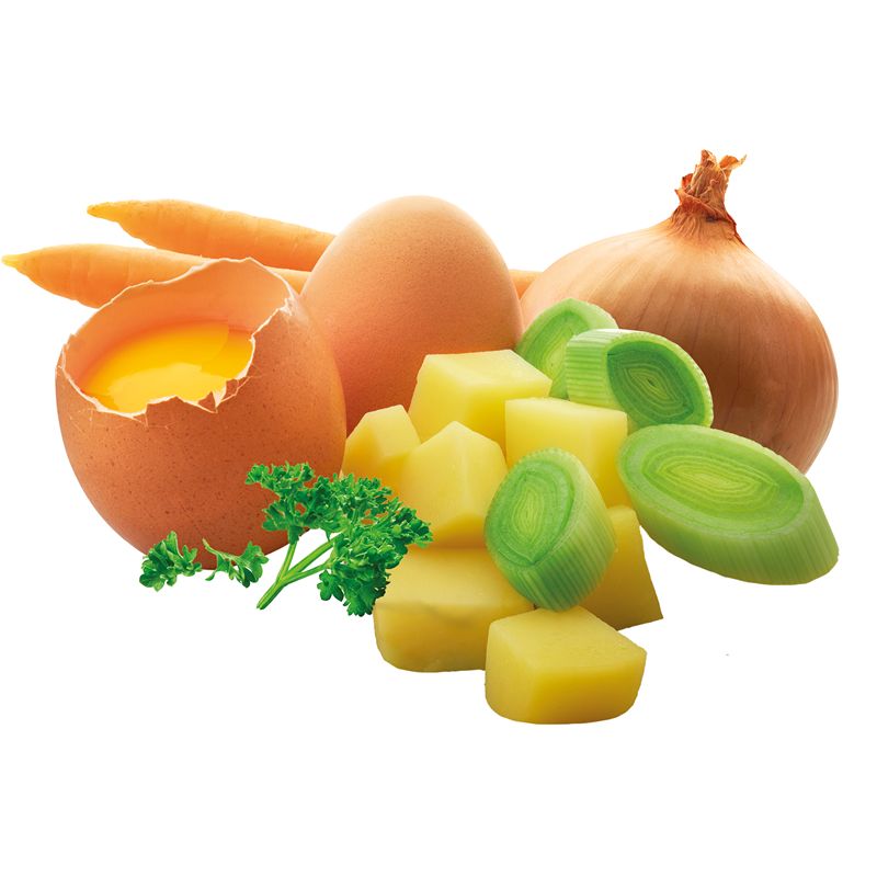 Eipoeder (26%), aardappelvlokken (19%), melkpoeder, aardappelzetmeel, ei (10%), wortel (5%), ui (5%), zonnebloemolie, prei (3%), zout, glucosestroop, peterselie (0,52%), peper