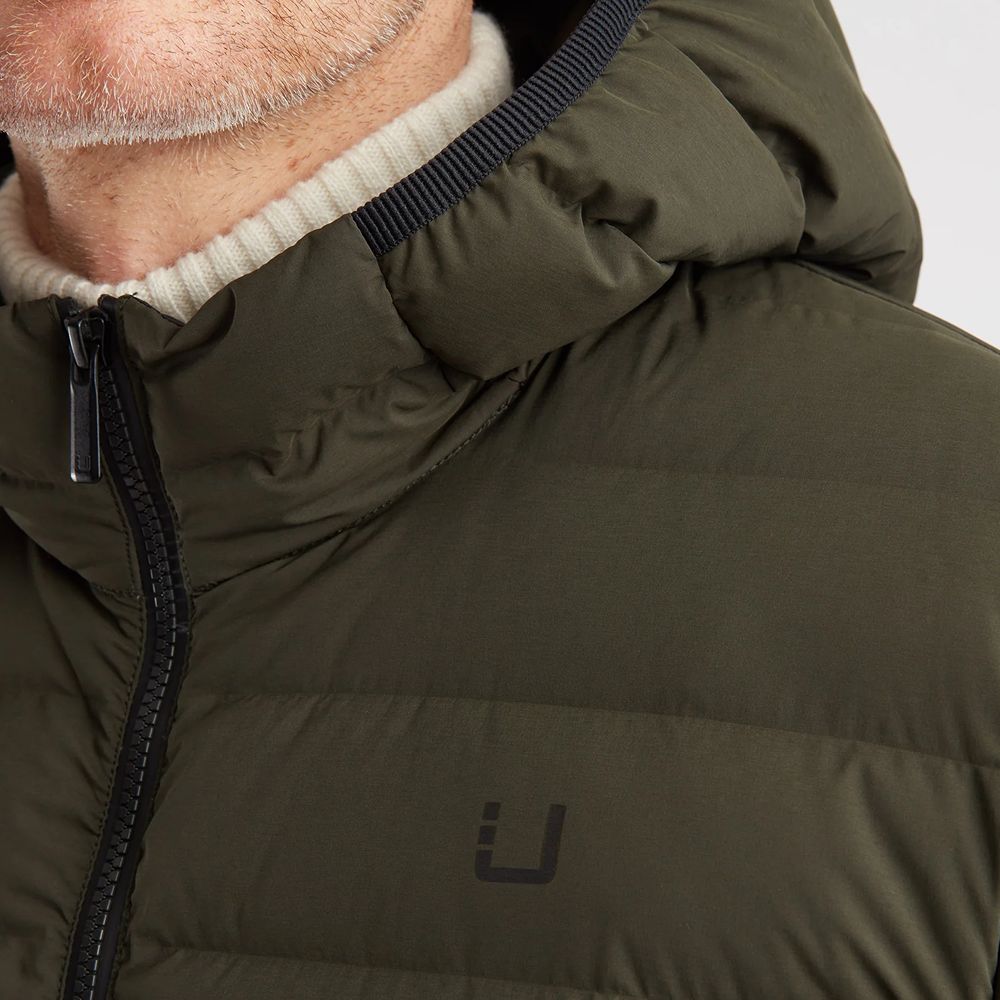 De UBR Sonic Delta Hooded Jacket is een zeer lichte donsjas van stretchstof. De stof rekt in vier richtingen. De donsbanen zijn strak geweven in plaats van gestikt waarmee het risico op donslekkage tot een minimum wordt gereduceerd. Het is een zeer stijlvolle en comfortabele donsjas voor die periodes dat de winterjas net te warm is en de zomerjas nog net te fris.