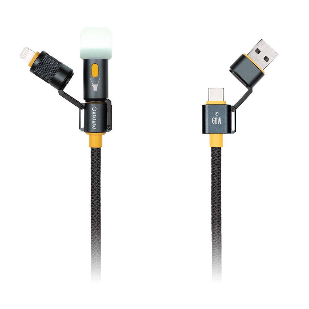 De WakaWaka Connect is een slimme USB-kabel met een geïntegreerd LED-lampje en verwisselbare adapters. Het ene uiteinde heeft een USB-A connector, het andere een Lightning-adapter die stevig vastklikt wanneer dat nodig is. Laad je apparaten op, verlicht je weg en blijf voorbereid, waar je ook naartoe gaat.